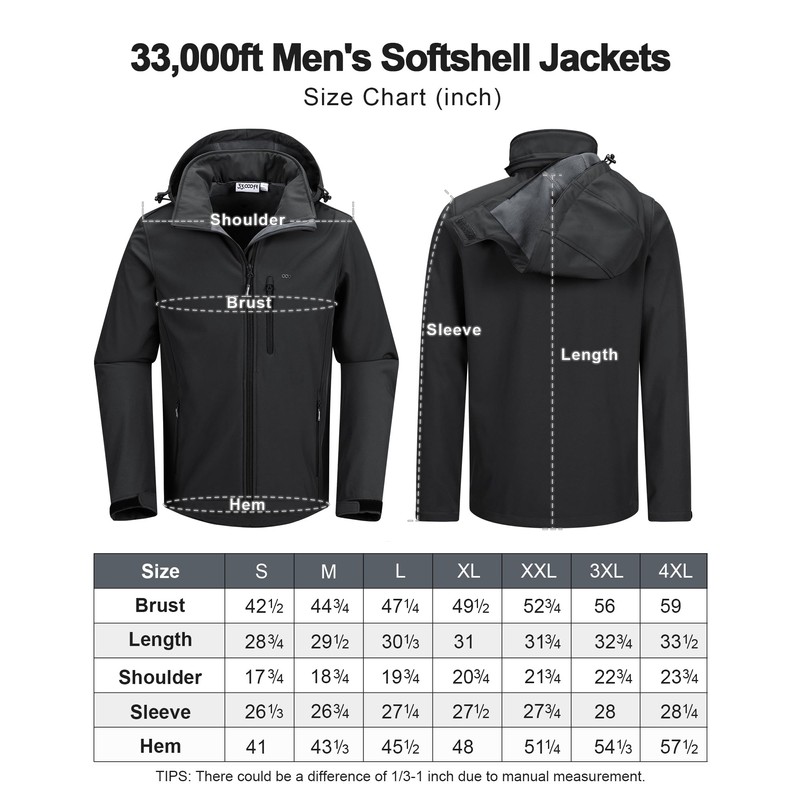 33,000ft 33,000ft Men's Waterproof Jackets Fleece Lining Softshell Jacket - Multi Pockets Outdoor Windproof Coat With Detachable Hood Black L