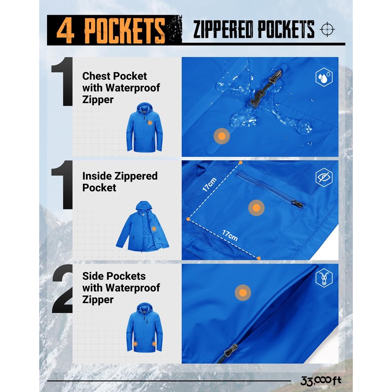 • [Adjustable Fit] 33,000ft rain jacket mens waterproof with hood features drawstring hooded to adjust the width and height, and adds extra guard and warmth; Adjustment drawcord hem and hook and loop cuffs seal out the cold wind and offer a flexible fit; Front storm flap and lined chin guard provide more comfort.