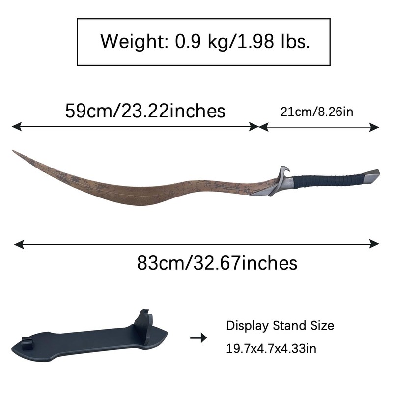 - Dimensions-Weight: 0.9 kg / 1.98 lbs. Overall length 83cm/32.67 inches, blade length 59cm/23.22 inches. Display stand 19.7x4.7x4.33 inches.