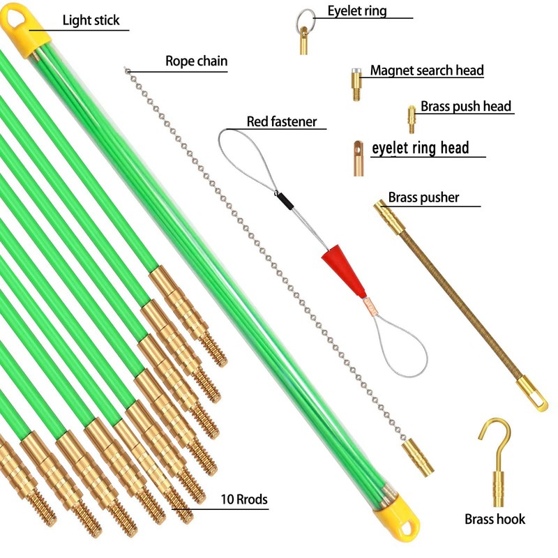 - Cable Fishing Tape Set Includes: 10 fiberglass rods (3/16" diameter) with 8 practical accessories, such as fluorescent rods, red fastener, eyelet ring head, eyelet ring, brass hook, magnet search head, brass pusher, rope chain and so on. More several different accessories tips can be used in differing situations for pulling wire, snagging wire, ect