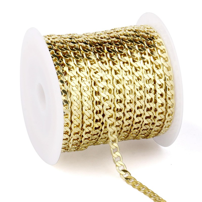 [33 FT] Gold Curb Chains Roll, 4mm Wide 14K Gold Plated Brass Curb Link Chain Roll Bulk for Jewelry Making