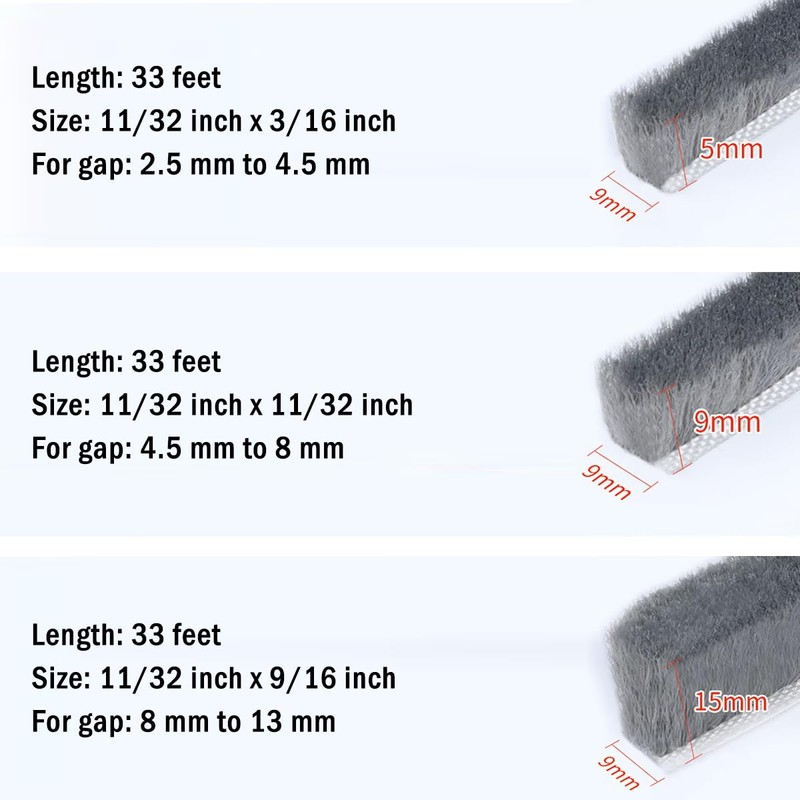 - 【Adhesive Pile Weather Strip】0.6 inch brush suitable for gaps from 8-13mm. 0.35 inch brush suitable for gaps from 4.5-8mm. 0.2 inch brush suitable for gaps from 2.5-4.5mm. Pls measure your gap size before buying the seals