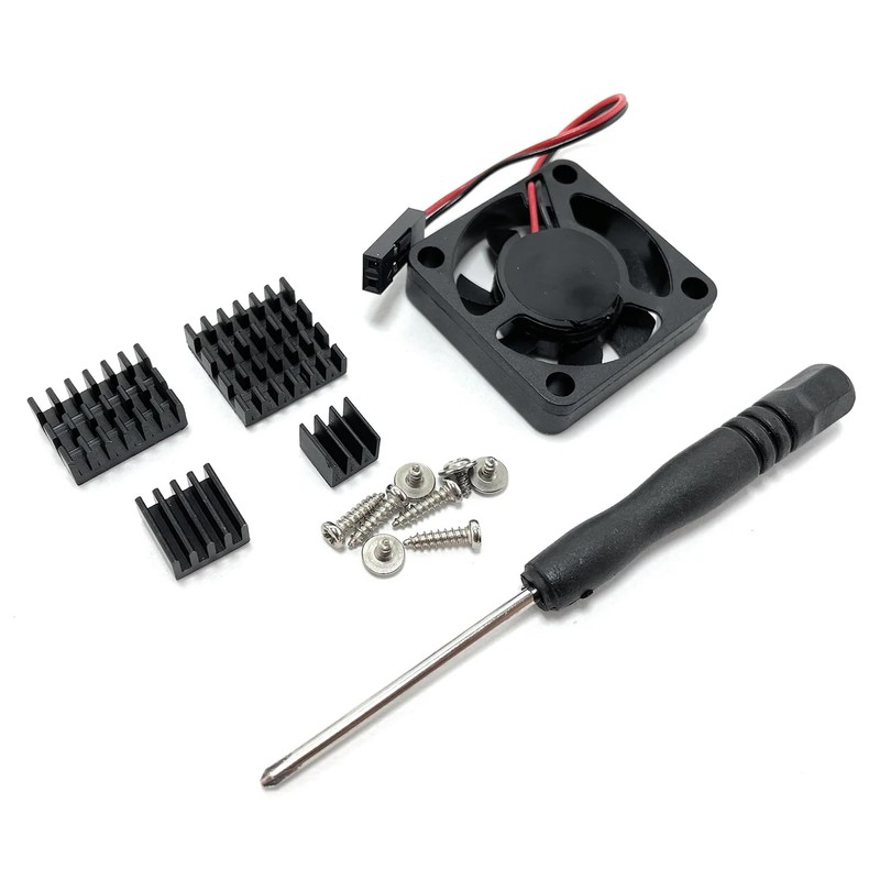 Este producto incluye una carcasa de plástico ABS negro, un juego de disipadores de calor de aluminio, un mini ventilador y la tornillería necesaria para el ensamblaje.