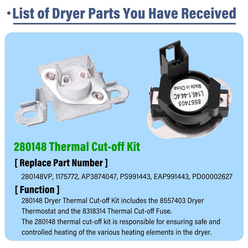 - 280148 Thermal Cut-off Kit Replaces 279973VP, 3391913, 3404151, 3404152, 3977395, 8318314, 897710, AP3094323, PS334387, EAP334387