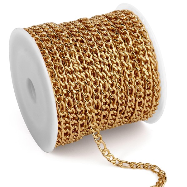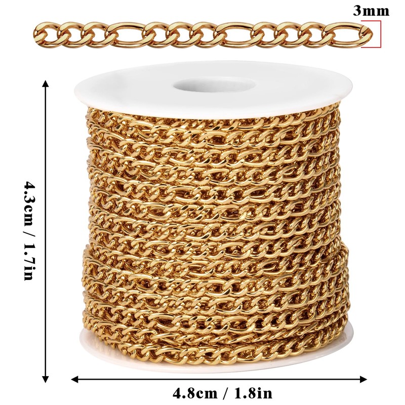 33FT 18K Gold PVD Plated Stainless Steel Figaro Chain Roll, 3mm Width Gold Figaro Link Chains Spool Bulk for Jewelry Making