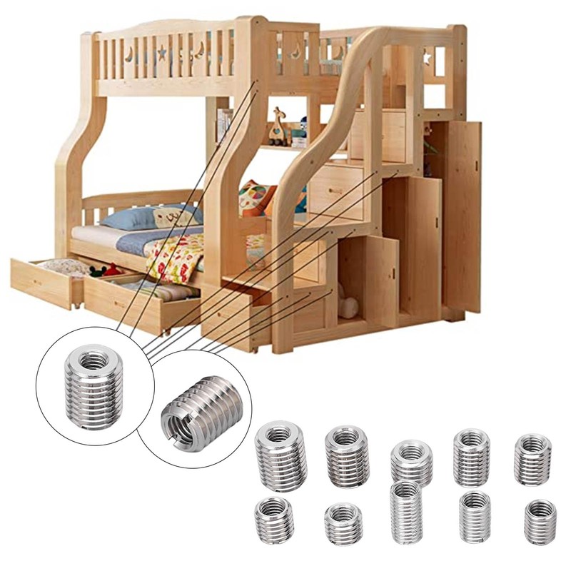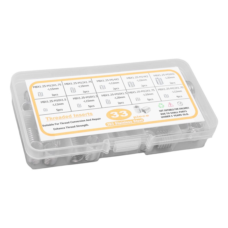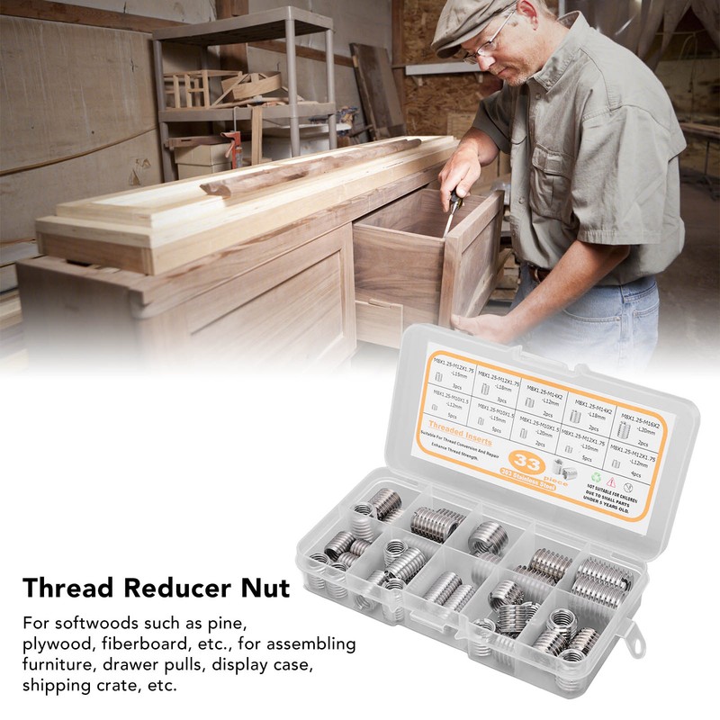 1、SPECIFICATIONS: Includes 33pcs M8 x 1.25 threaded inserts, with multiple different sizes to meet different repair needs, easy to use and replace. 2、SELF TAPPING: Unique self tapping design male threads, these threaded repair inserts facilitate tapping and have good tension resistance. 3、EASY TO USE: Drill a hole, then tighten the threaded insert with hex wrench, the tapered male thread so that it does not pull out due to vibration. 4、STAINLESS STEEL: These threaded inserts are made of stainless steel, with high hardness, wear and corrosion resistance and long service life. 5、WIDE APPLICATION: For softwoods such as pine, plywood, fiberboard, etc., for assembling furniture, drawer pulls, display case, shipping crate, etc.