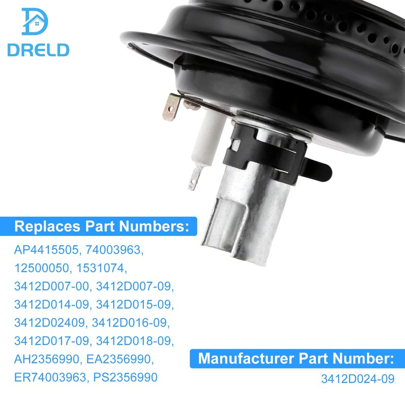 • > [REPLACES PART NUMBER]: Manufacturer Part Number: 3412D024-09. Replaces Part Numbers: AP4415505, 74003963, 12500050, 1531074, 3412D007-00, 3412D007-09, 3412D014-09, 3412D015-09, 3412D02409, 3412D016-09, 3412D017-09, 3412D018-09, AH2356990, EA2356990, ER74003963, PS2356990. If you are uncertain about whether the burner head fits your range, we are willing to help you.
