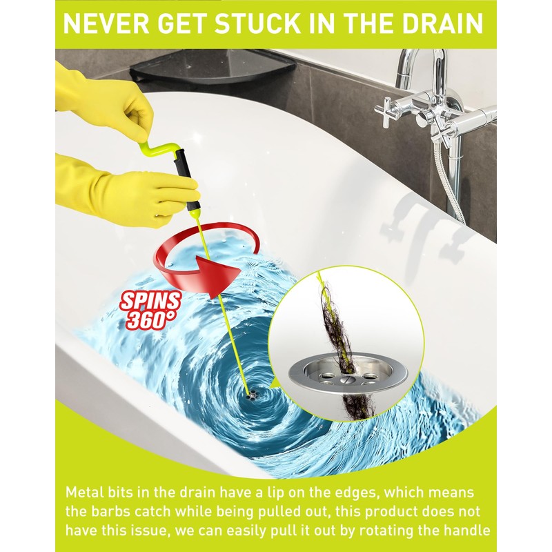 - Reusable Rotating Handle Design: Previous drain clog remover tool on the market often get stuck in the drain due to barbs or stubborn clogged. we have designed a reusable rotating handle that effortlessly resolves the problem. When sink snake stuck, simply rotating the handle allows for easy extraction without damaging your pipes or catching on drain parts.