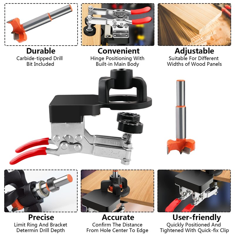 - Double clamp design: we have improved the hinge drilling template, a triple bearing drill sleeve, to reduce the drill oscillation distance and improve the accuracy of the hole opening. Double front and rear clamps that fix the layout firmly again without damaging the surface. Suitable for door thickness: 15-25mm, opening depth 10-15mm