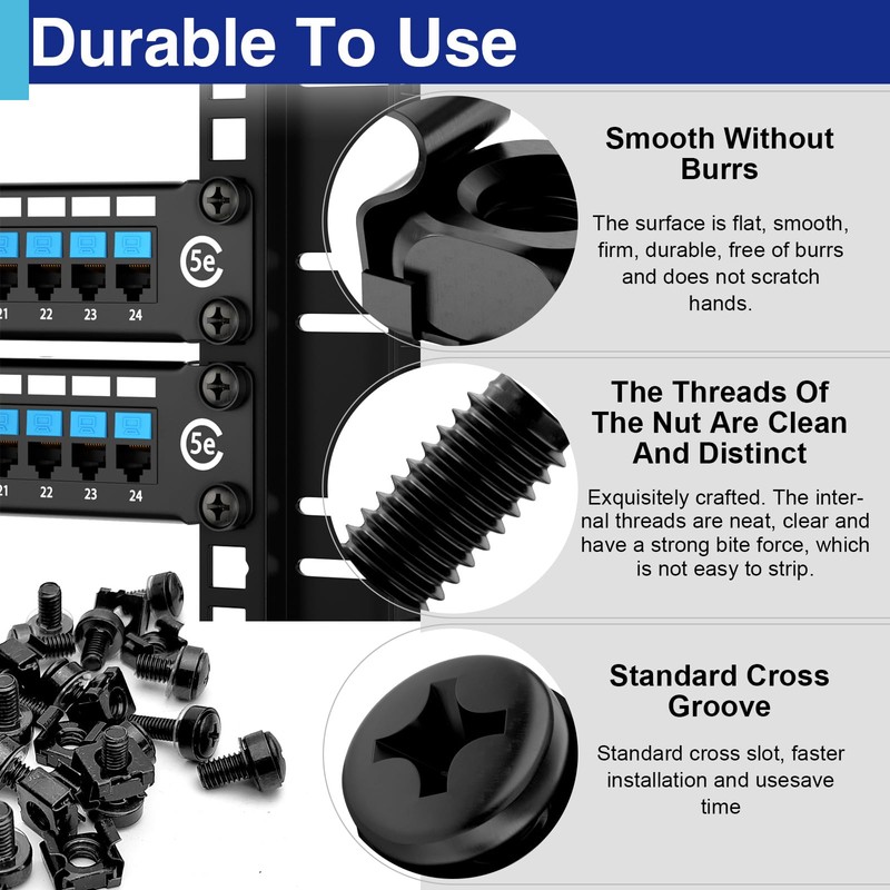 - Precision Dimensions: Featuring M6 screws (6mm/0.24" diameter) with uniform pitch and smooth-top design for effortless gripping, these simplified fasteners lock securely in place, making them essential for IT professionals and network enthusiasts.