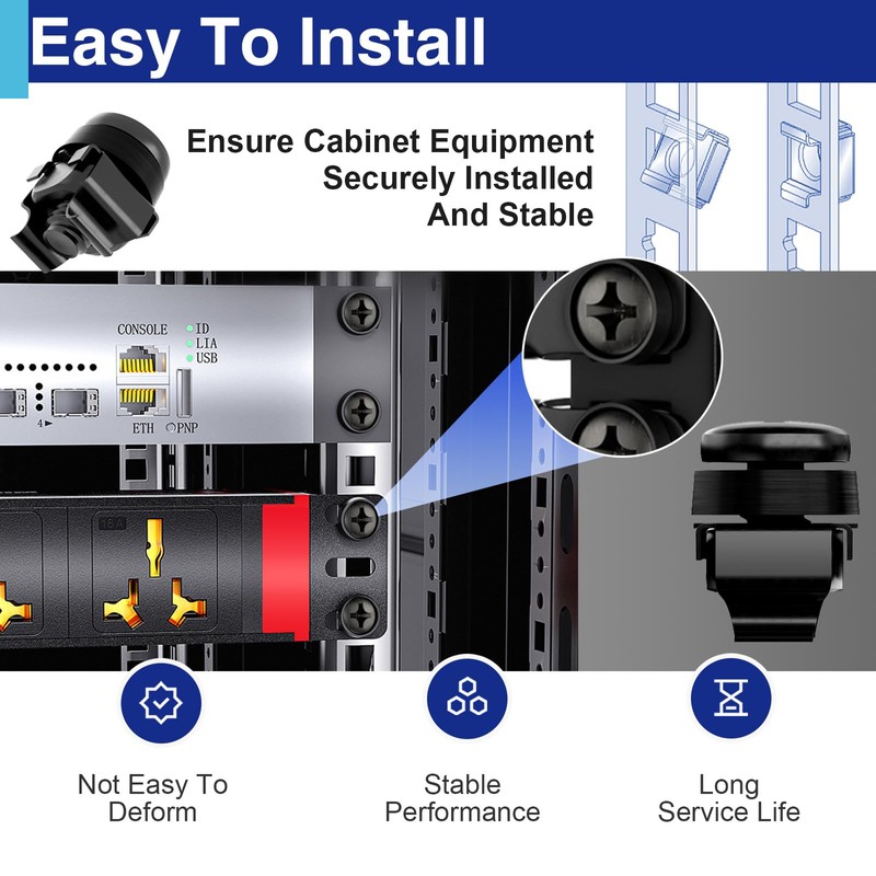 - Complete Kit Contents: This set includes 50 sets of Rack Mount Screws, square cage nuts, black washers, and anti-slip plastic pads—providing a comprehensive solution for installing server racks, cabinets, enclosures, and DIY projects.