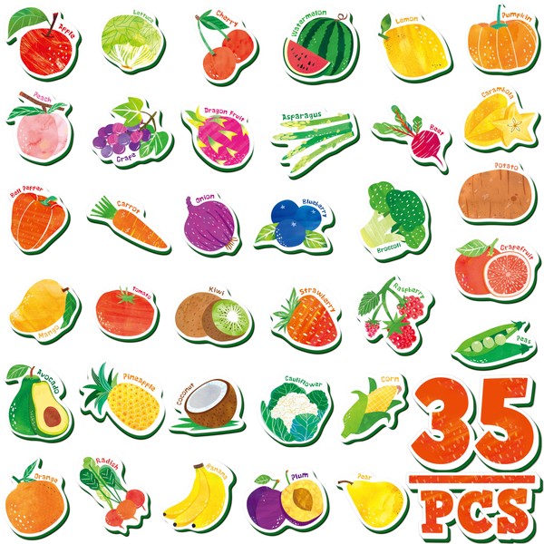 - Vibrant Magnets: The set comes with 35pcs vibrant fruit and vegetable magnets, which can be used to teach children about different colors and shapes and the names of different fruits and vegetables. Each magnet features an adorable cartoon image of a fruit or vegetable, along with its name, making it a great tool for early literacy development.
