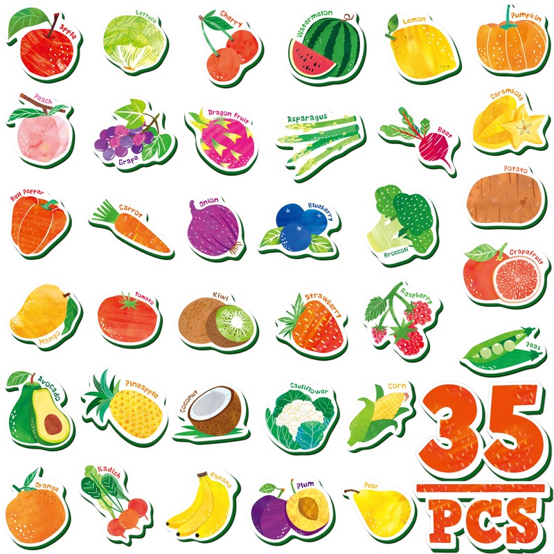 Vibrant Magnets: The set comes with 35pcs vibrant fruit and vegetable magnets, which can be used to teach children about different colors and shapes and the names of different fruits and vegetables. Each magnet features an adorable cartoon image of a fruit or vegetable, along with its name, making it a great tool for early literacy development.