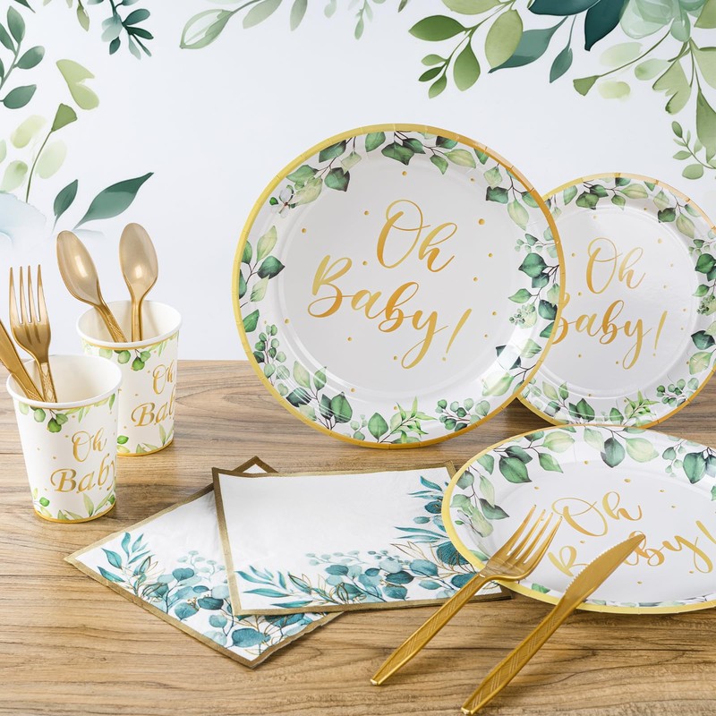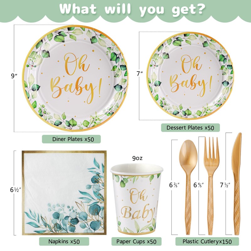 350PCS Sage Greenery Baby Shower Party Supplies Serves 50 Guests - Oh Baby Paper Plates, Napkins,Cups, Plastic Forks, Knives,Spoons for Baby Shower Bridal Shower Wedding Baptism Party Decorations