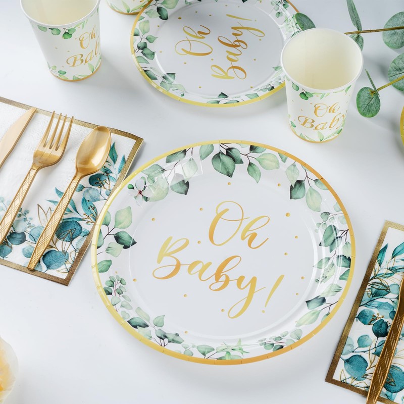 - - Oh Baby Baby Shower Decorations: Make a statement with these oh baby baby shower decorations in sage green, perfect for celebrating the arrival of a little one. The sage green paper plates and napkins add a touch of elegance to the party.