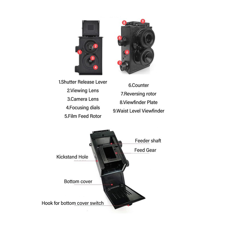 - Dual Lens: There are two lenses, one for capturing photos onto film and the other used as a viewfinder for framing, the main advantage of this is that you can compose your photos from waist height.