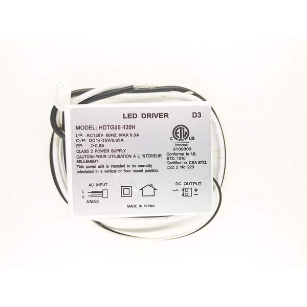 Item Number: HDTG35-120H-D3 D3 is for 35W LED Ceiling Fixture DJL Dimmable LED Driver Genuine Replacement Parts. This is version #2 and is a fully dimmable LED Driver. Note, if your current DJL LED Driver is not dimmable, this Version #2 will make your current fixture dimmable. The alphanumeric D1, D2, or D3 on the upper right side of your Driver indicates that the driver is fully dimmable. Input: 120VAC Output: DC14-35V Wattage: 35W Please see images for driver specification.