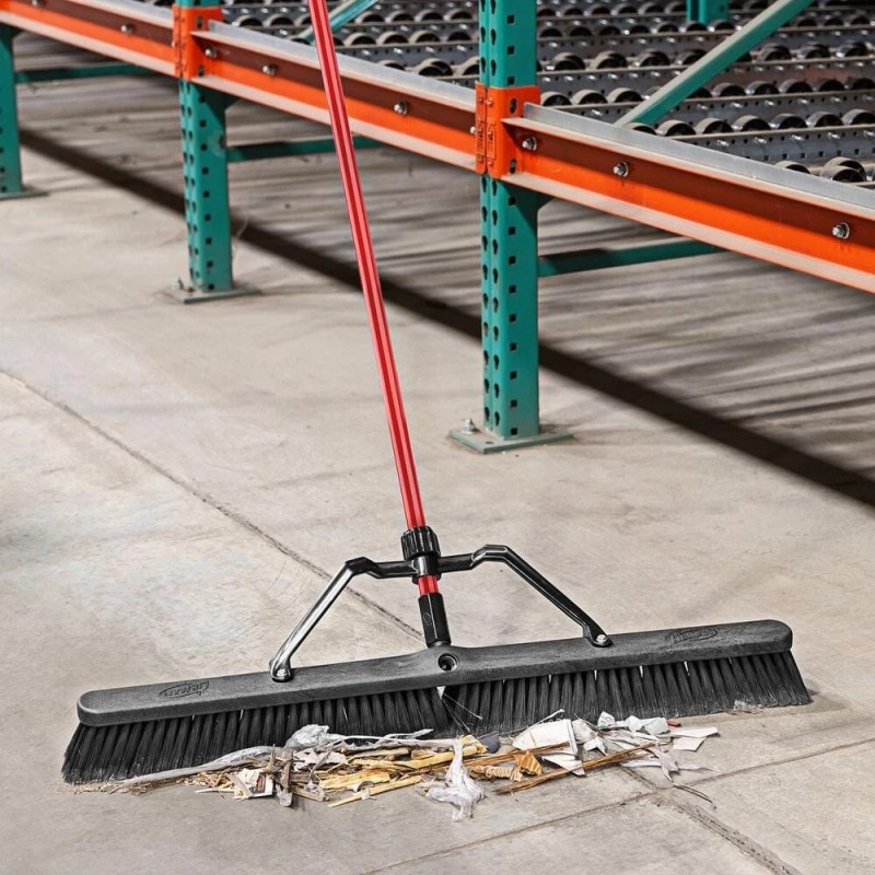With large and heavy amounts of debris, the 36 in. Smooth Surface Heavy-Duty Push Broom is ideal for any smooth surface cleanups. Factory-assembled for durability, this pushing broom features 3 in. soft, recycled PET, stapled fibers and a 1 in. diameter steel handle. The electrostatic powder coated paint will not chip, even from handle dings. With a 37 in. sweeping width, this push broom is excellent for large spaces such as garages, barns, sheds, patios, warehouses, and more. Due to its sheer size, this Libman broom is a great broom for outdoor use in large areas or one of the best brooms for sweeping up smooth warehouse concrete floors. No need for a broom holder or hangers for brooms as the handle grip has a convenient hanger hole for easy storage in your garage or shed.