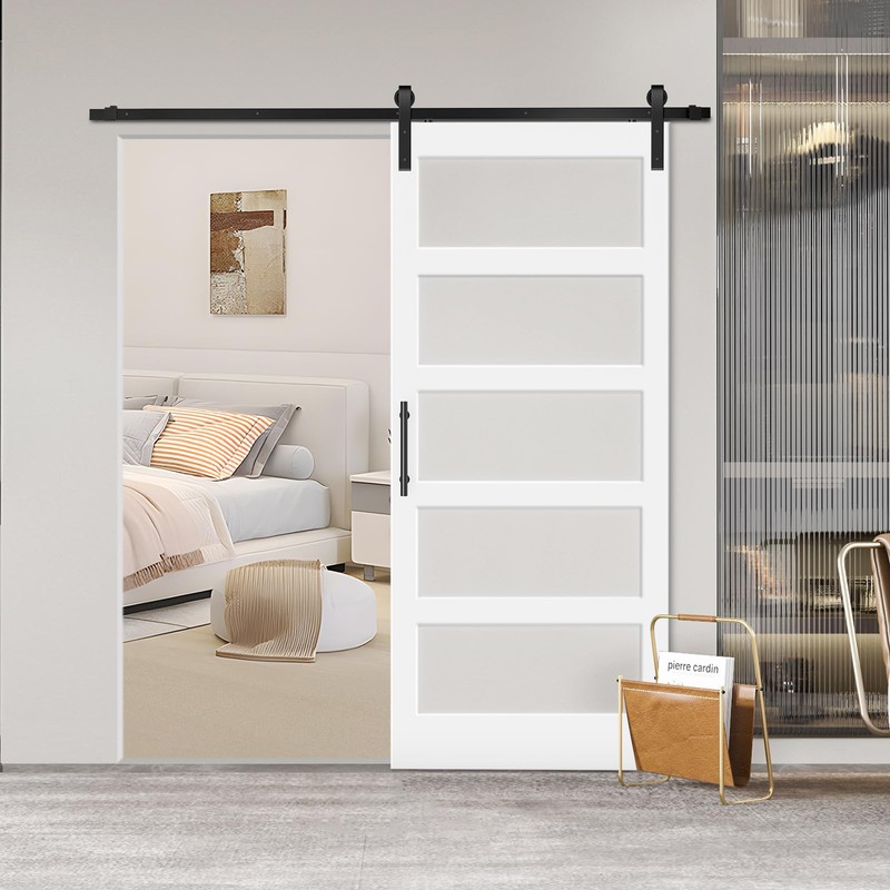 36 in x 84 in Glass Sliding MDF Barn Door with 6.6FT Sliding Door Hardware Kit, 5 Tempered Frosted Glass, Slab Inside Covered with Water-Proof PVC Surface, Simple DIY Assembly