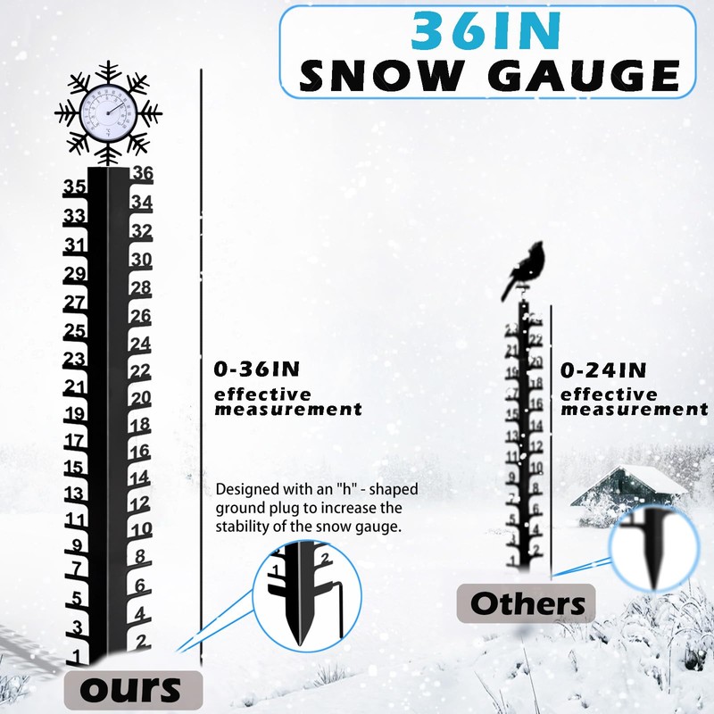 - H-foot Design and Easy To Install Firmly: No special installation skills are required. Just connect the four pieces of metal to complete the installation. This upgraded 36 in snow gauges outdoors best rated with H-legs can be firmly inserted into the ground without shaking.