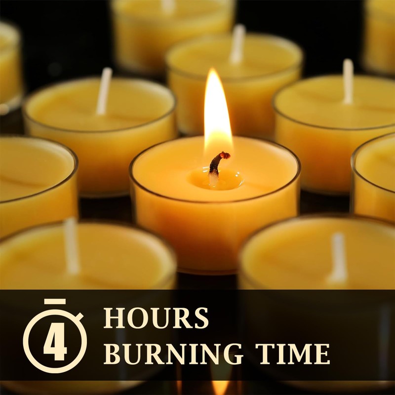 - 4 HOURS BURNING TIME: Designed for efficiency, these beeswax tealight candles offer a long-lasting burn of 4–5 hours per candle. The steady, soft glow is ideal for creating a relaxing or elegant atmosphere