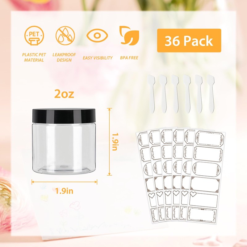 - WHAT YOU WILL GET: Include 36 pack 2 oz clear plastic jars with lids, 8 cosmetic spatulas and 54 Lables