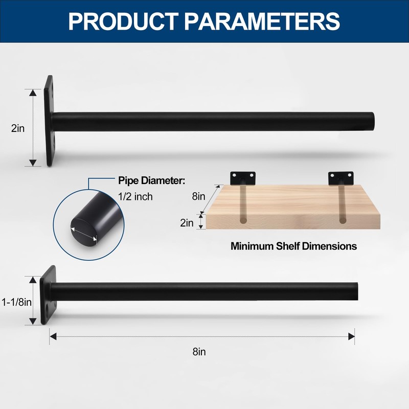 - Size - Rod is 8 inches long with 12mm diameter. Backplate is 2 inches wide and 1-1/8 inches height. Our hidden shelf brackets hardware pack includes 36 x metal floating brackets, 72 x heavy-duty screws, 72 x drywall anchors