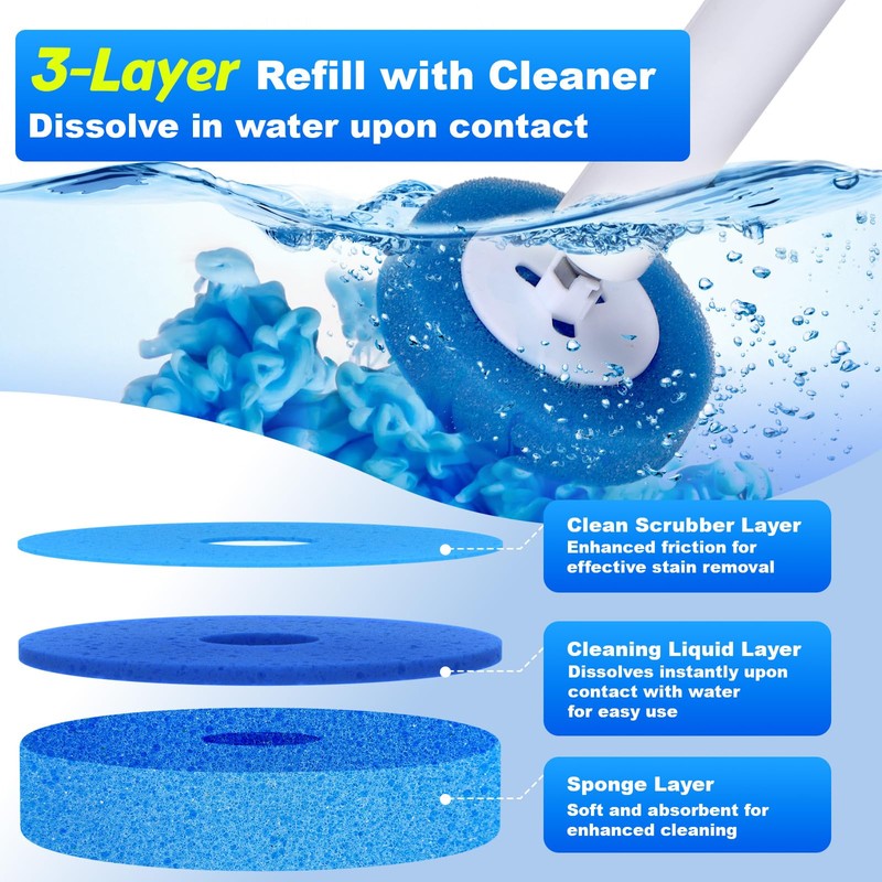- Three-layer Filling Design:These disposable toilet wand refills consist of a clean scrubber layer, a cleaning liquid layer, and a sponge layer. The brush head can fit closely to the inner wall of the toilet, ensuring thorough cleaning without any dead corners and reaching hard-to-reach edges.