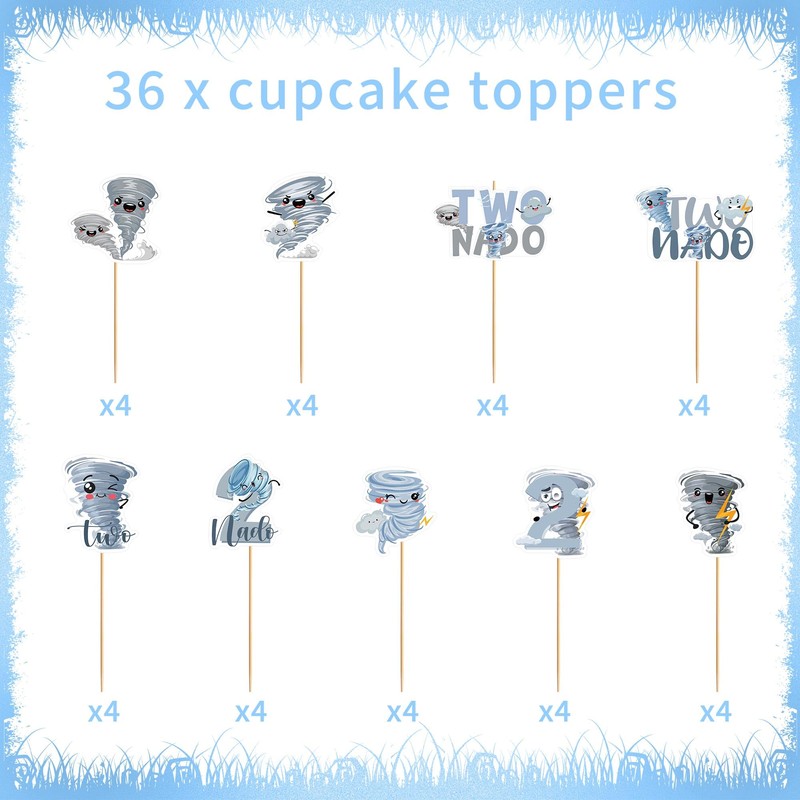 36 Pcs Tornado Birthday Party Decorations, Cute Grey Tornado Themed Cupcake Toppers, 2nd Birthday Cupcake Picks Party Supplies (9 Designs)