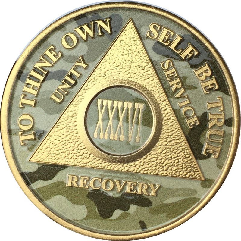 - 36 Year Alcoholics Anonymous Sobriety Medallion Camo Color Gold Plated Coin