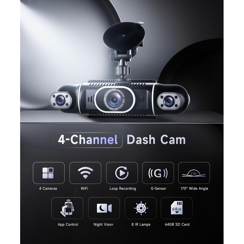 360°4-Channel Dash Cam FHD 2K+1080P×3 Front/Rear/Inside/Side Car Dash Camera with WiFi, APP Control, 64GB SD Card Included, 8 IR Night Vision, G-Sensor, 24/7 Parking Mode
