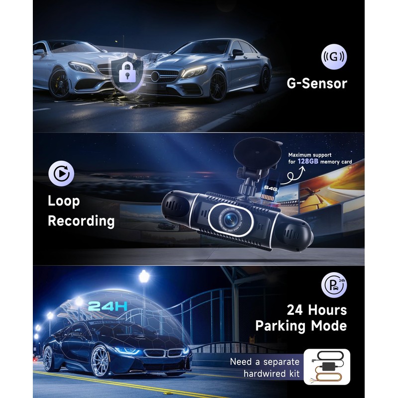 - 【Car Cameras 24 Hours Parking Mode】Leave your vehicle parked and powered off—this 4-channel dashcam shifts automatically into parking mode, delivering round-the-clock monitoring. Important: Parking surveillance requires a separately purchased hardwire kit
