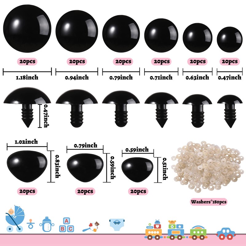 • Great Size Selection: These safety eyes come with the following dimensions: safety eyes 30mm, 24mm, 20mm, 18mm, 16mm, 12mm 20 each; safety noses 26mm, 20mm, 15mm 20 each, the variety makes it easy to find the perfect size. Enough quantity and assorted sizes to meet your different DIY needs.