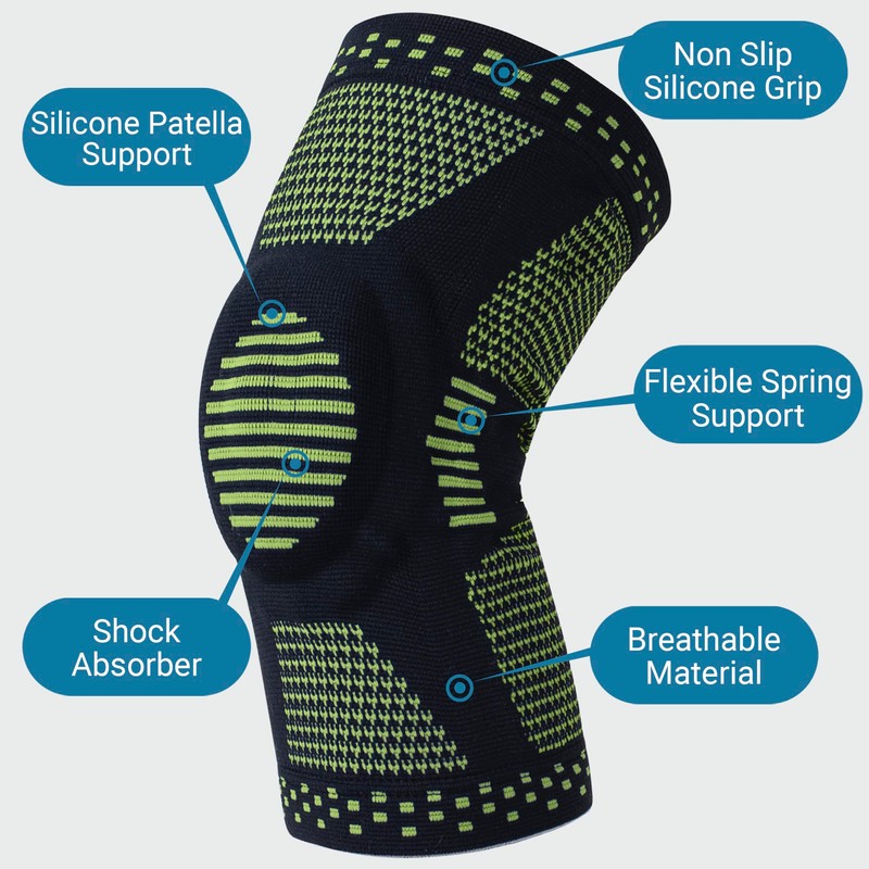 360 RELIEF - Compression Knee Brace with Patella Gel Pad and Side Stabilizers | Supports for Joint Comfort, Sports and Running, for Women and Men | Medium, Green with Mesh Laundry Bag
