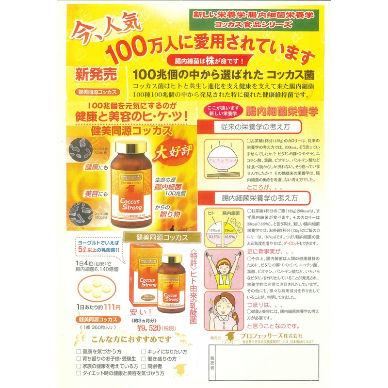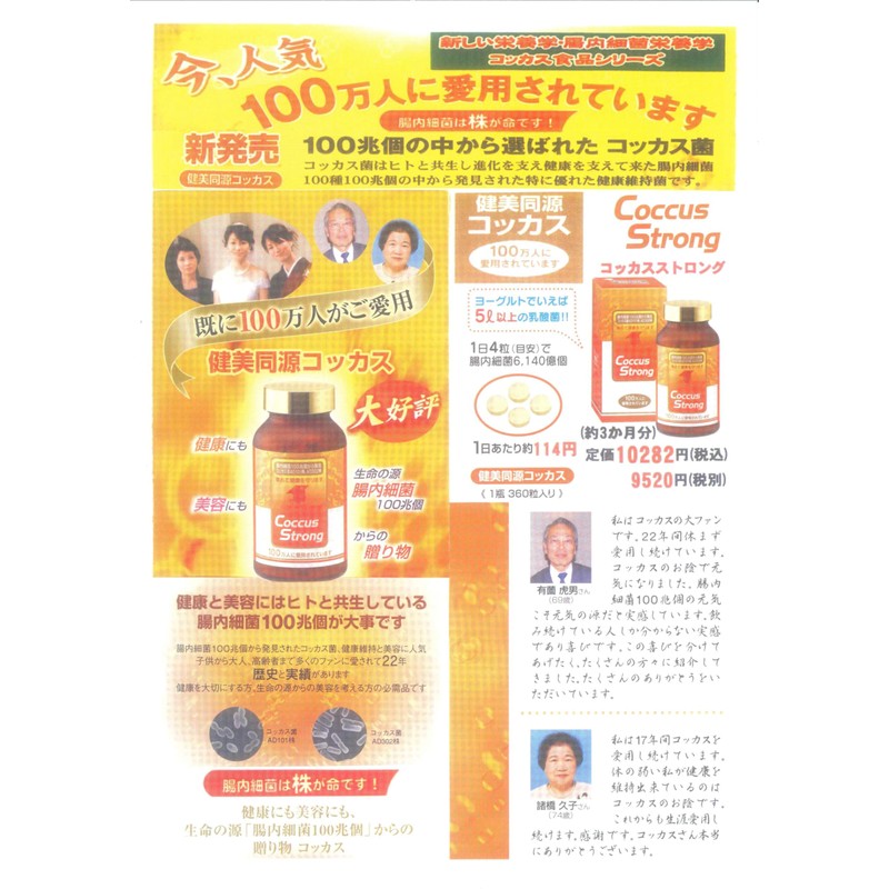 - コッカス・ストロングx1瓶 1瓶360粒入=定価10282円税込、ご愛用目安1日4粒~12粒、濃縮乳酸菌コッカス菌4粒当り6千億個含有、商品詳細は添付画像参照、発売元・アドバンス・フローラ科学研究所