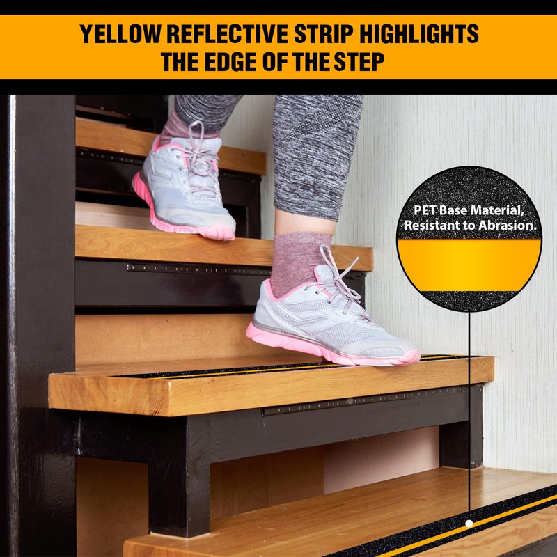 - Anti-Slip Tape with Reflective Stripe: High traction waterproof tape with a 12 mm wide yellow reflective strip that enhances visibility in low light; Highlights edges of steps and potential hazards; Essential for homes and workplaces to protect children, elderly, and pets on slippery surfaces