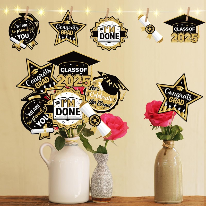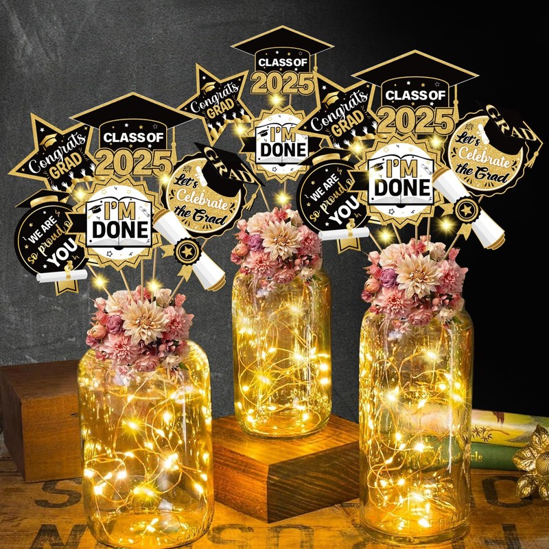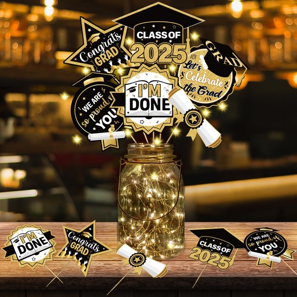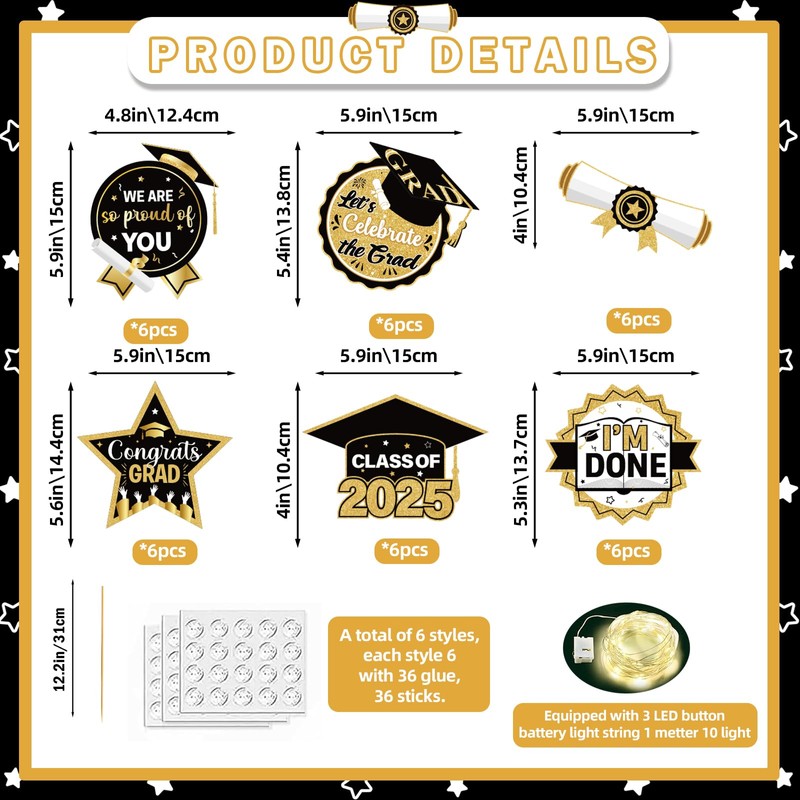 - Package Include: You will receive 36pcs Gold Black 2025 graduation centerpieces for tables, there are 6 style,each has 6pcs, and 1*3M LED light, supply graduation table decorations for your lovely graduation party.