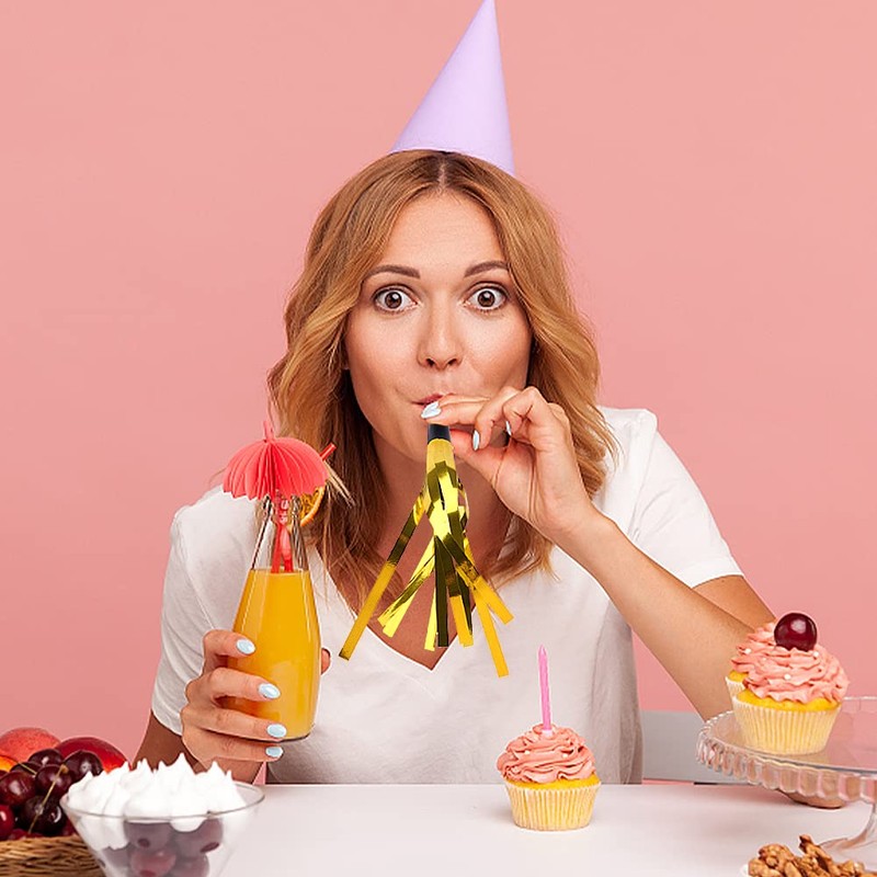 1. Party blower features multiple gold glitter strips, when you blow it hard, these gold glitter strips collide and make funny sound.