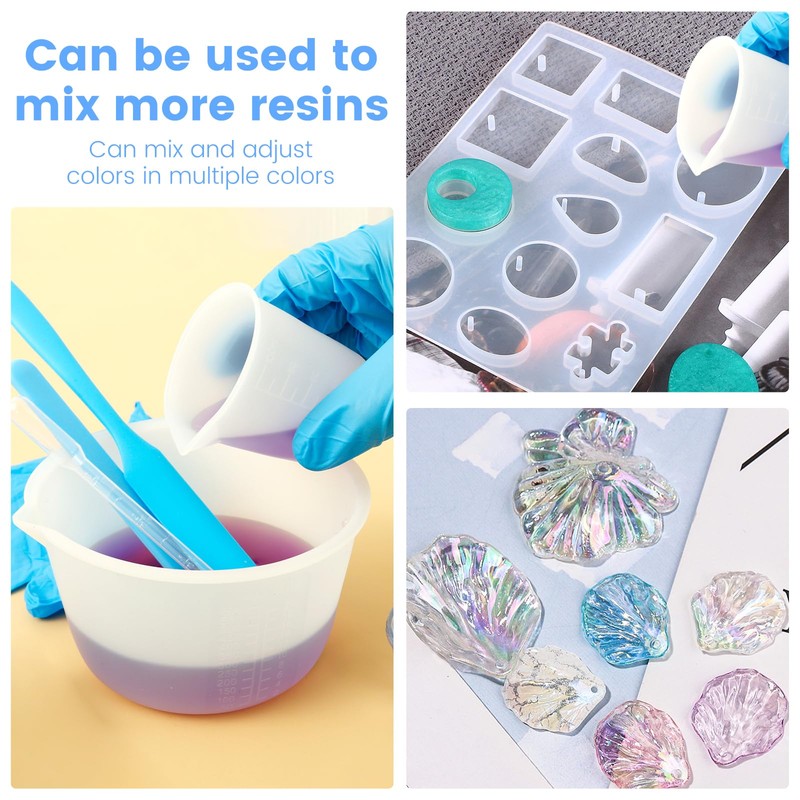 Mainly made of silicone, this silicone resin measuring cups tool kit features a smooth surface, providing both antislip and nonstick properties. It's sturdy, heat-resistant, and tear resistant. It is easy to clean and reusable. Ideal for resin mixing, DIY crafts, jewelry making, paint mixing, and more.