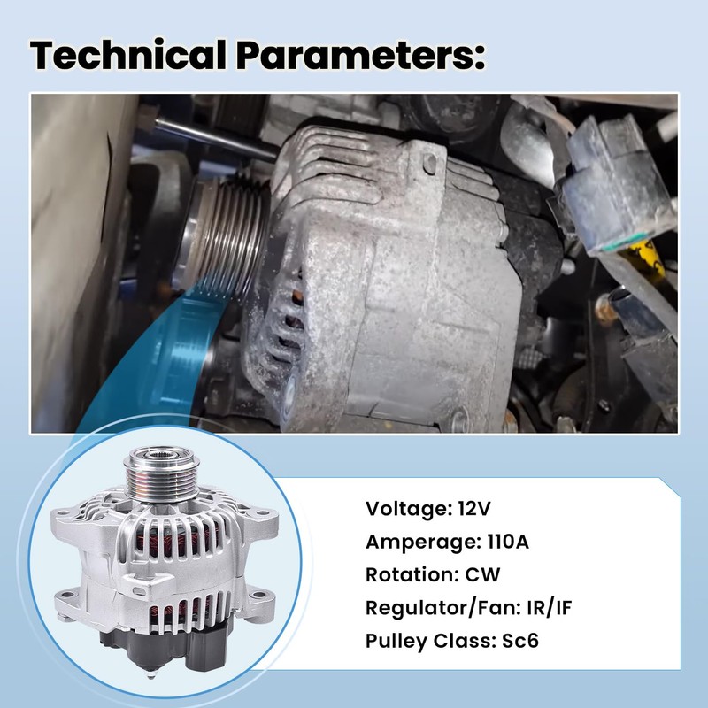 - Technical Parameters: Voltage: 12V; Amperage: 110A; Rotation: CW; Regulator/Fan: IR/IF; Pulley Class: Sc6