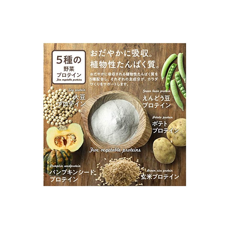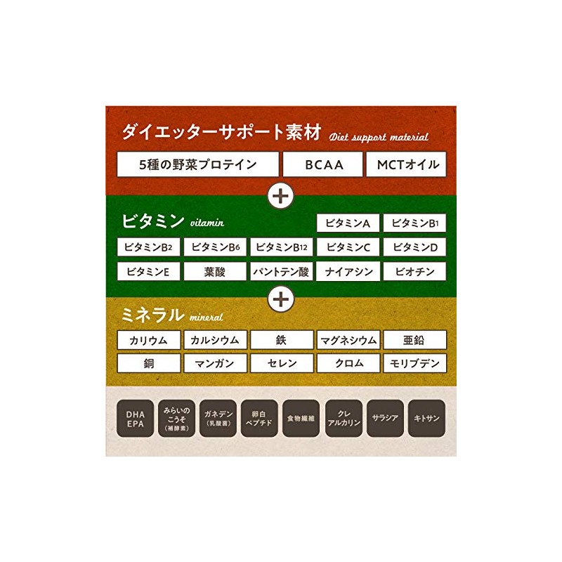 植物性たんぱく(大豆たんぱく(大豆を含む:遺伝子組換えでない)、えんどう豆たんぱく、カボチャ種子粉末、玄米たんぱく、ブロッコリー粉末、アーモンド粉末、大豆ペプチド、ポテト抽出物)(国内製造)、さつまいもデキストリン(鹿児島県産、宮崎県産)、海藻カルシウム、ポリデキストロース、いちご果汁末、クレアチンモノハイドレート、植物発酵エキス末(キウイ・オレンジ・リンゴを含む)、デキストリン、ミネラル含有酵母(マンガン、亜鉛、鉄、銅、クロム、セレン、モリブデン)、システインペプチド含有酵母、卵白ペプチド(卵を含む)、乳酸菌末、DHA・EPA含有精製魚油、マルトデキストリン、食用精製加工油脂、中鎖脂肪酸トリグリセリド、加工デンプン、植物性キトサン、サラシアエキス末/L-ロイシン、塩化カリウム、L-バリン、L-イソロイシン、ビタミンC、ヘム鉄、酸化マグネシウム、甘味料(ステビア)、香料、蛋白加水分解物(乳由来)、ナイアシン、パントテン酸Ca、ビタミンE、ビタミンB1、ビタミンB6、ビタミンB2、ビタミンA、葉酸、ビオチン、ビタミンK、ビタミンB12、ビタミンD
