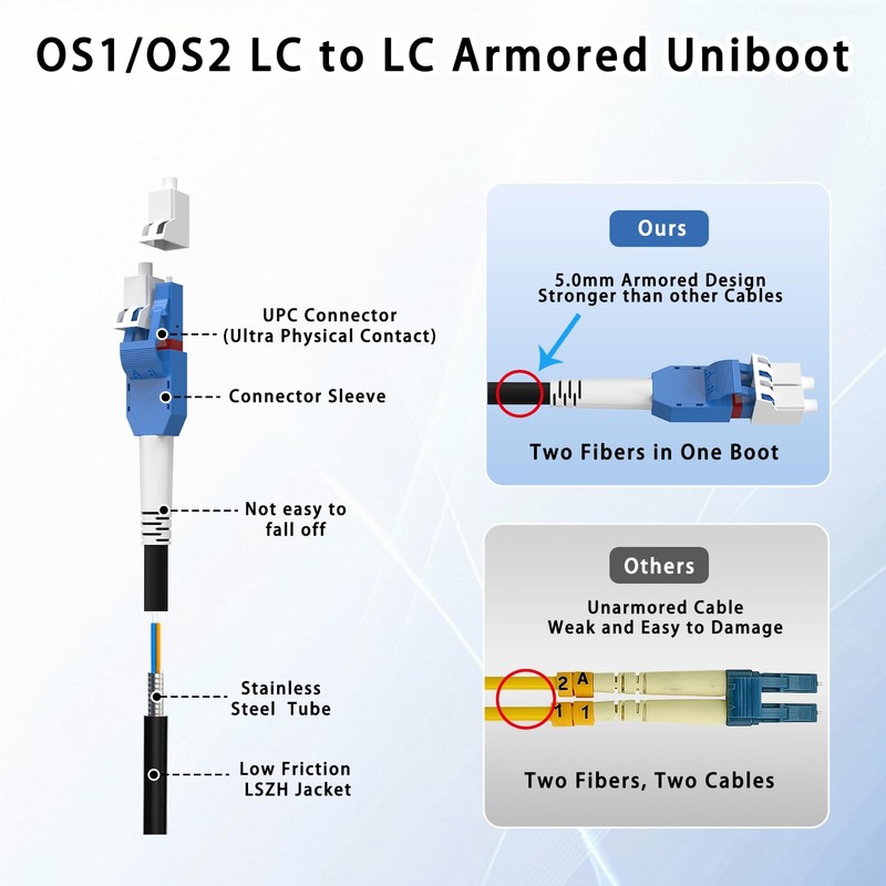 - 【Uniboot Connectors for Dense Cabling】Equipped with Uniboot LC connectors—two fibers in a single housing—this cable reduces clutter, improves airflow, and simplifies cable routing. Ideal for high-density patch panels, data centers, telecom base stations, backbone links between buildings, and connections between enterprise core switches.