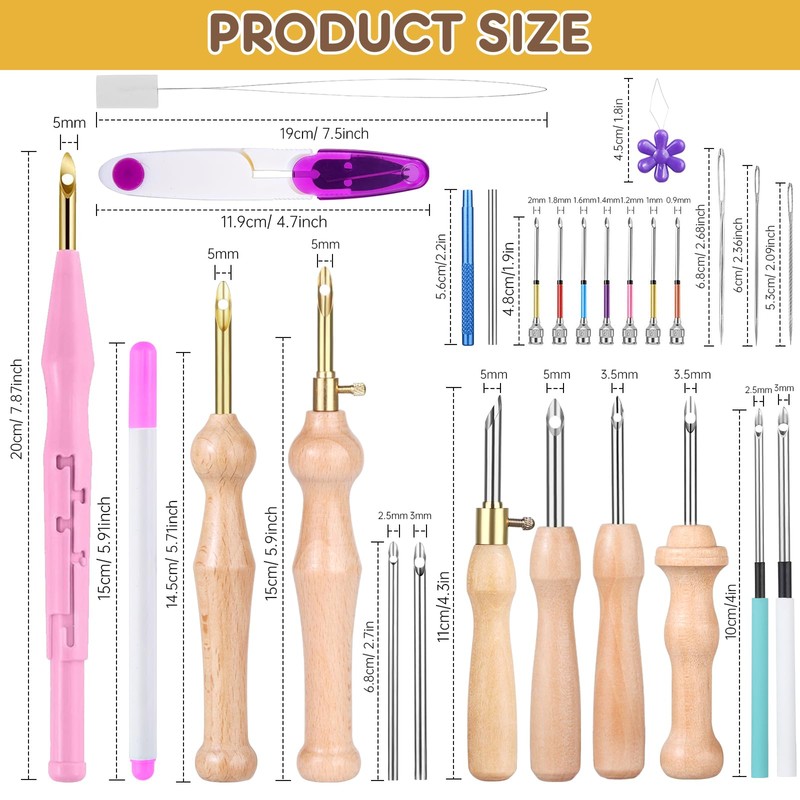 - 【Product Size】Product Dimensions: Punching needles with wooden handles are 3.5 mm and 5 mm in diameter, while those with metal handles are 0.9 mm, 1 mm, 1.2 mm, 1.4 mm, 1.6 mm, 1.8 mm, and 2 mm in diameter.The adjustable plastic needle is 5mm in diameter and the plastic storage box measures approximately 7.3×5.1×1.6 inches.
