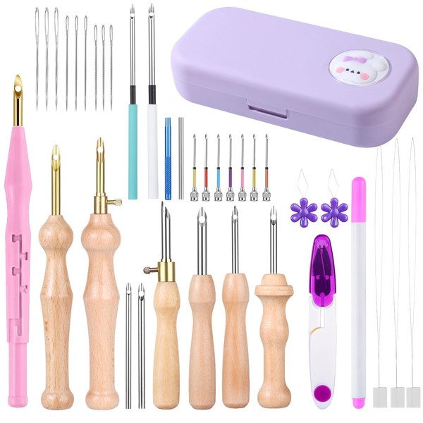37Pcs Punch Needle Kit, Punch Needle Tool with Adjustable Punch Needle, Metal Handle with Various Size Needles for Adult Beginner Embroidery Cross Stitching DIY Craft Decoration(Purple)