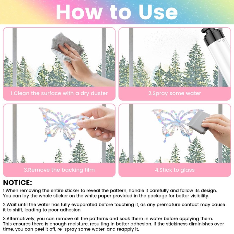 - 【Easy to Use】To use Suncatcher Sticker, simply spray water mist on the glass, peel off the sticker from the plastic paper, and stick the smooth side onto the glass. When you don't need it, just peel off Decorative Window Stickers and there won't be any residue left on the window.