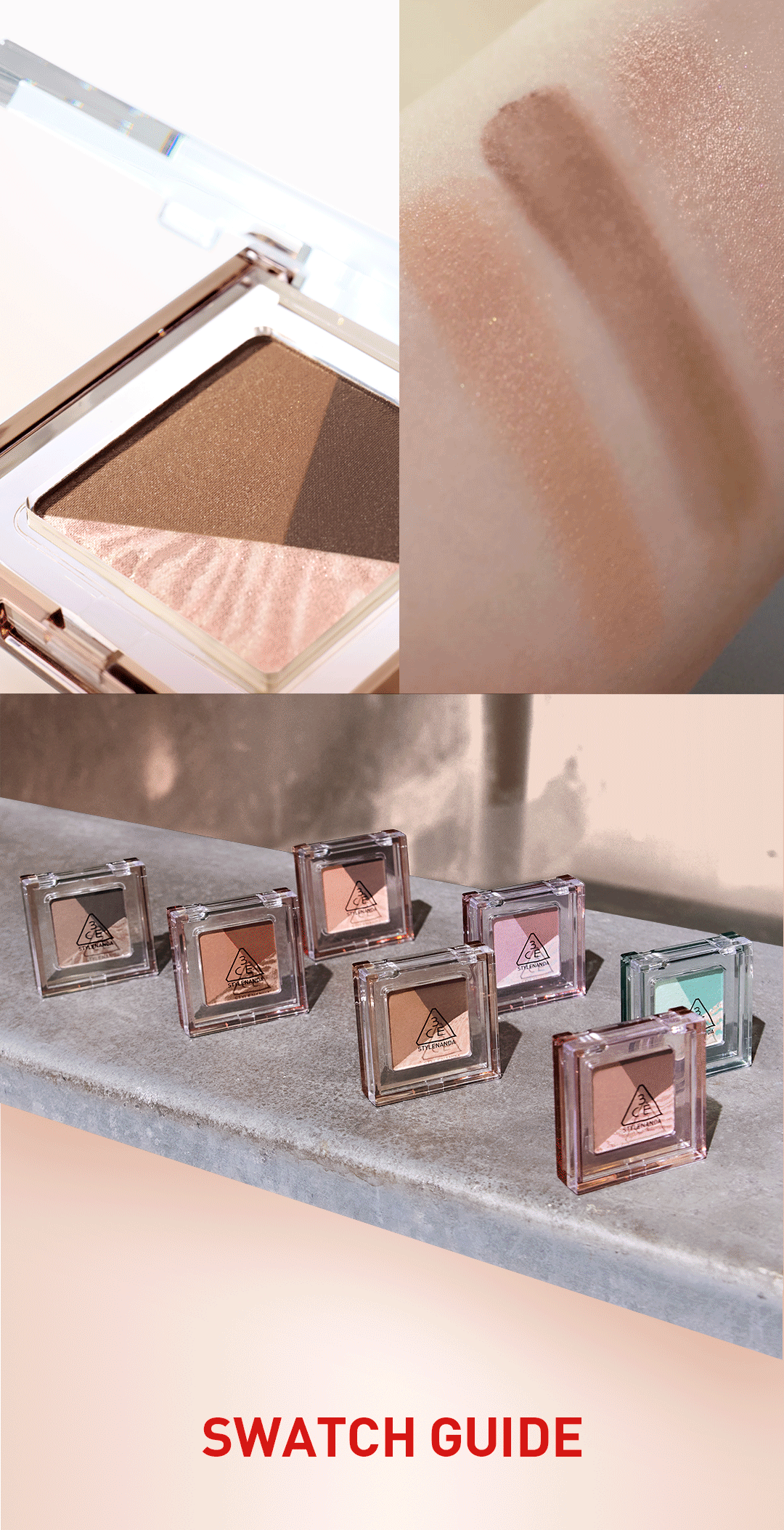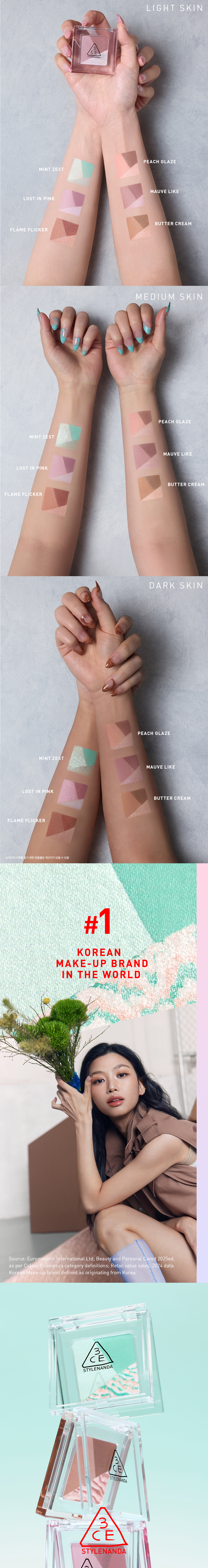 A palm-sized compact showcasing three carefully curated grids with just the must-have shades. A single-pan eyeshadow from 3CE, the tone-on-tone expert, delivering the perfect shade formula in a sleek, compact size. A triple-texture blend, from soft powdery chiffon to a distinctive marble shimmer finish.