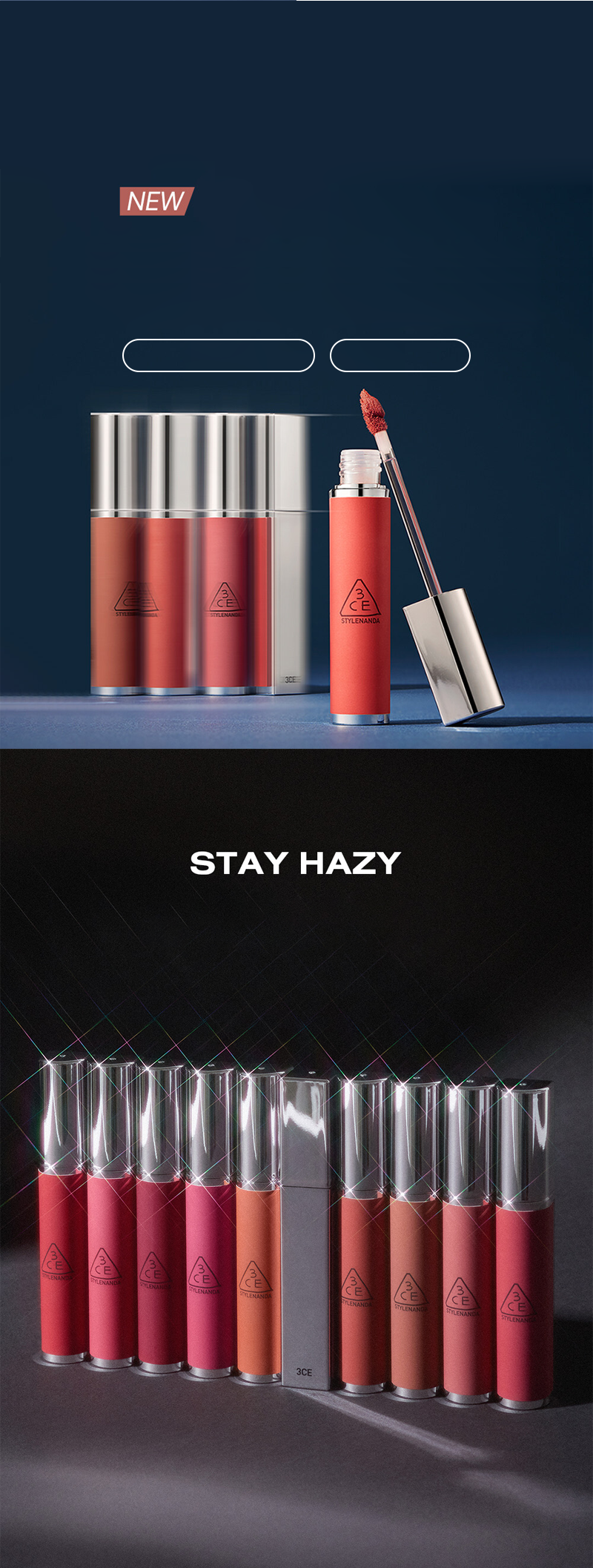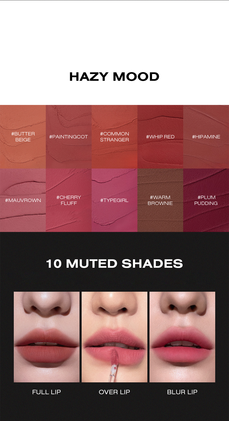 Like mist, it lingers on the lips, distinctly staying without any wavering, it's your very own hazy lip mood. This is a melty clay that settles calmly and adheres tightly. Comfortable and smooth non-drying sensation product. An intense matte finish is shown. This is a hazy color mood product that seems to linger on the lips. Various shades of medium tone and medium brightness show 10 color variations.