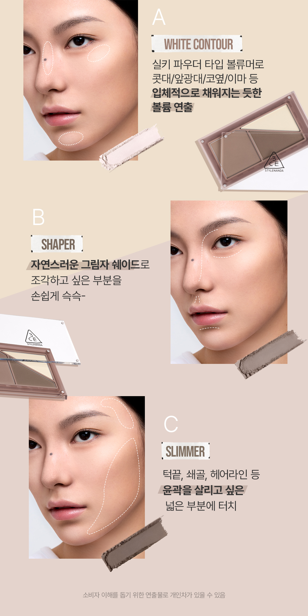 - Precautions when using: [Caution for use] a. If you experience any symptoms such as red spots, swelling, or itching due to direct sunlight during or after use, consult a specialist. b. Do not use on wounded areas. c. Storage and handling precautions: Keep out of reach of children. Avoid direct sunlight. [Exchange and Return Policy] For some 3CE products, returns and exchanges are not accepted if the product packaging is opened or damaged. The actual color of the product may differ depending on the resolution and brightness of your monitor. Please refer to the detail cut image for the most accurate color. Unauthorized use of any photos or content from Stylenanda’s website may result in legal action.
