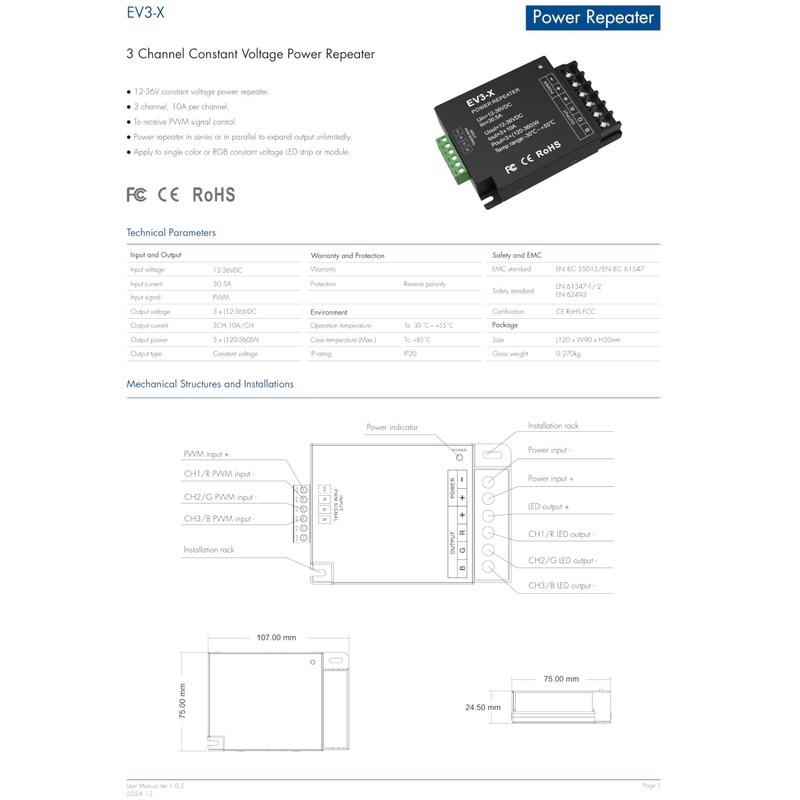 3CH High Speed Signal Amplifier DC12V/DC24V/DC36V Max 30A 5050SMD LED Strip Suitable for Long Distance LED Projects