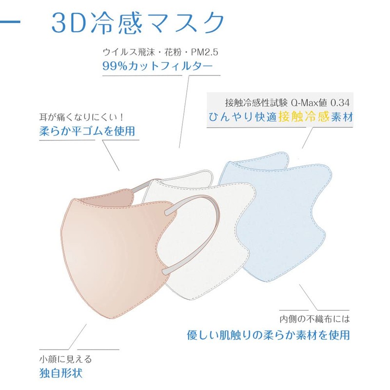 • カットフィルターを採用した不織布マスクです。不織布の中にメルトブロウン層を挟むことで、微粒子ろ過効率(BFE)を99.9%に高めました。顔にピッタリフィットし、小顔効果も抜群です。様々なカラーで提供しており、おしゃれに着用できます。